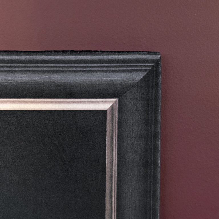 The printed velvet frame makes the artwork look as though it is surrounded by a solid dark grey wooden frame. Producing a strong three-dimensional effect.